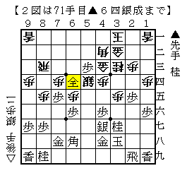 ここから☗3五歩☖4三金右☗6二銀☖3五歩☗5三歩☖6五歩☗7三銀不成☖8三飛☗6四銀成(2図)と進みました。